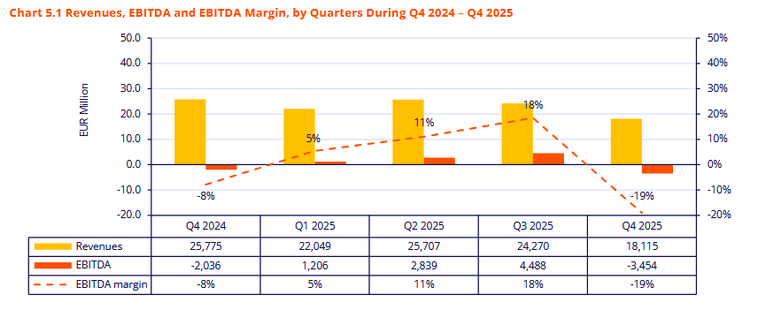 Zisk EBITDA dosáhl ve 4Q hodnoty -3,45 mil. EUR. EBITDA zahrnuje nepeněžní rezervu ve výši 3,2 mil. EUR související se sporem ohledně smluv na kapacitním trhu.