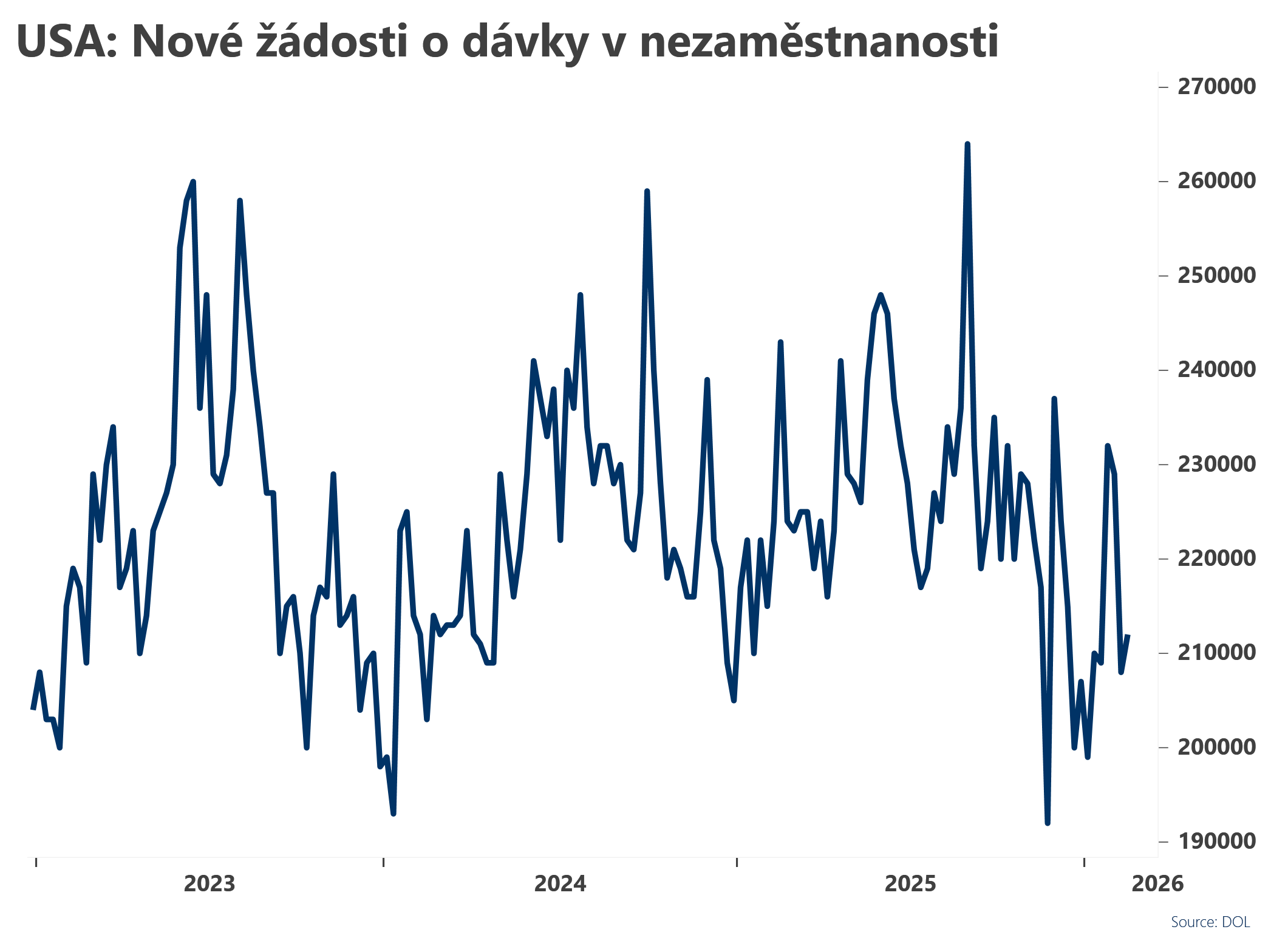 Počet nových žádostí o dávky v nezaměstnanosti v minulém týdnu stoupl na 212 tis. oproti revidovaným 208 tis. v předminulém týdnu. Trhy očekávaly nárůst 215 tis. nových žádostí.