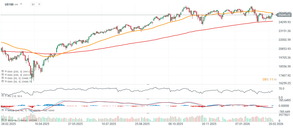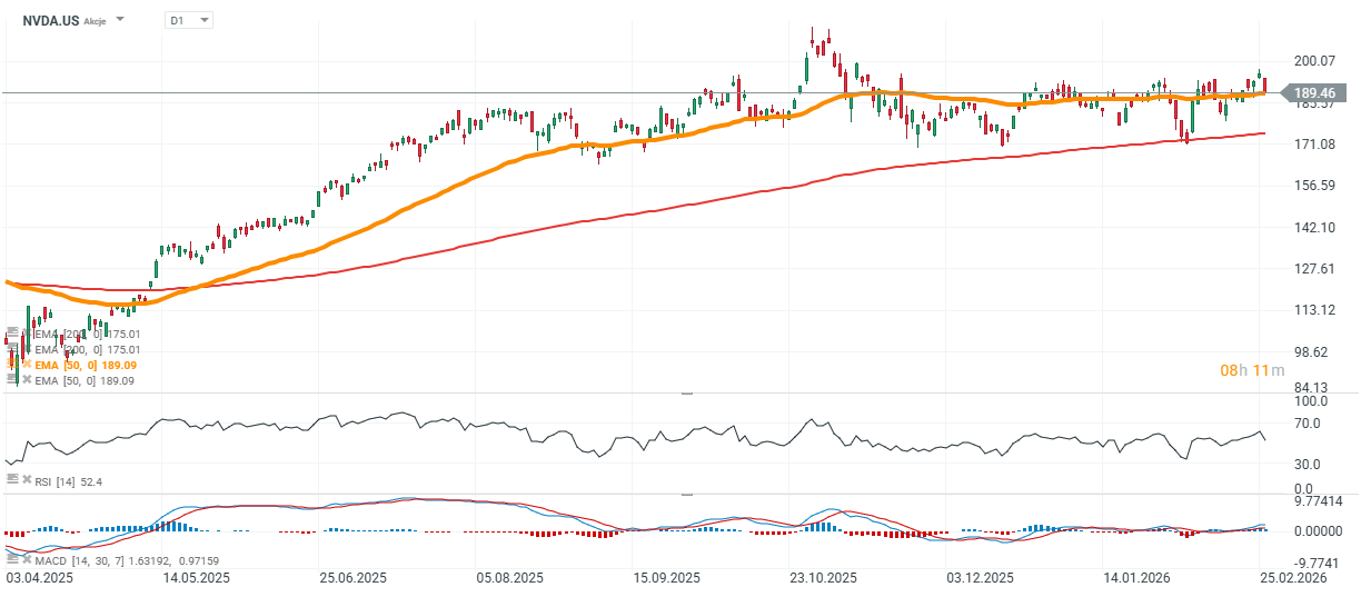 Sentiment na Wall Street dnes slábne. Hotovostní Nasdaq 100 klesá o 0,7 % a index S&P 500 ztrácí 0,3 %, a to navzdory rekordnímu kvartálu společnosti Nvidia zveřejněnému včera a velmi optimistickému výhledu. Indexy Dow Jones Industrial Average a Russell 2000 si vedou o něco lépe a obchodují se v rozmezí 0,15–0,3 %. Počet nových žádostí o podporu v nezaměstnanosti v USA minulý týden mírně vzrostl, ale zůstává na historicky nízkých úrovních. To naznačuje, že zaměstnavatelé se i přes zpomalující tempo náboru stále vyhýbají výraznějšímu propouštění.