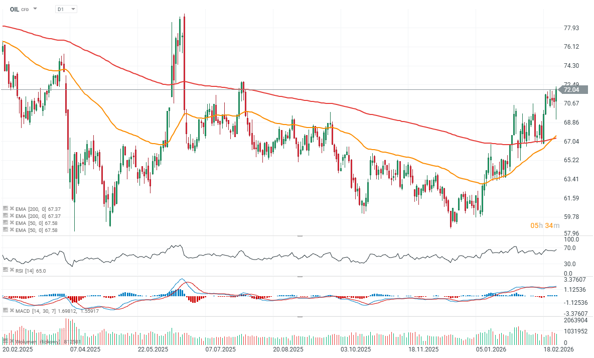 Ropa dnes posiluje téměř o 2 % poté, co íránská státní média uvedla, že Teherán nedovolí, aby obohacený uran opustil zemi. Trhy tak zvyšují sázky na možnou vojenskou eskalaci na Blízkém východě, kde Spojené státy soustředily významné vojenské síly.