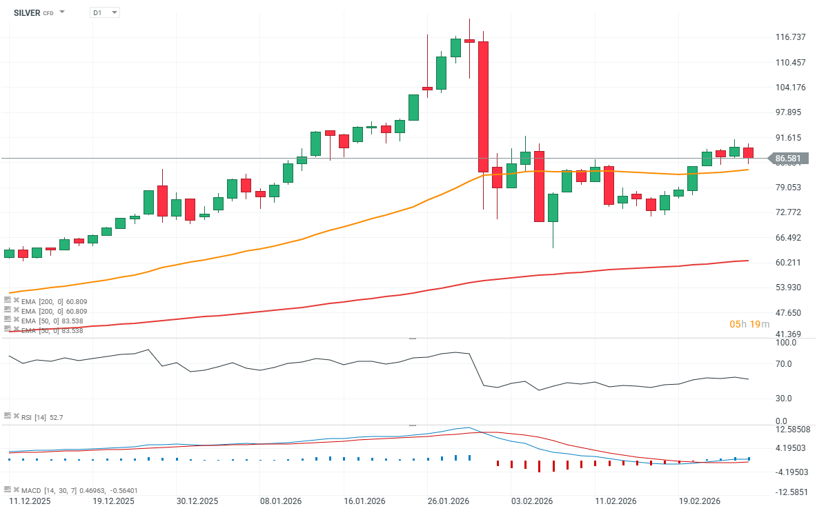 Stříbro znovu reagovalo poklesem po otestování technicky významné oblasti 90–91 USD za unci z pohledu price action. Silnější medvědí impuls by mohl cenu stlačit pod 50denní EMA (oranžová linie) a v extrémním scénáři naznačit i návrat k úrovni 70 USD za unci. Naopak návrat nad 90 USD je nyní klíčovým úkolem pro býky.