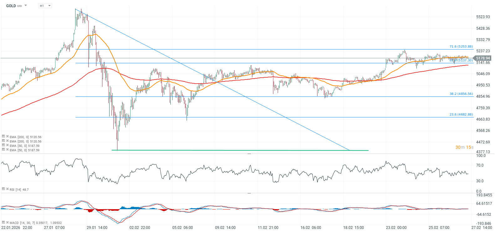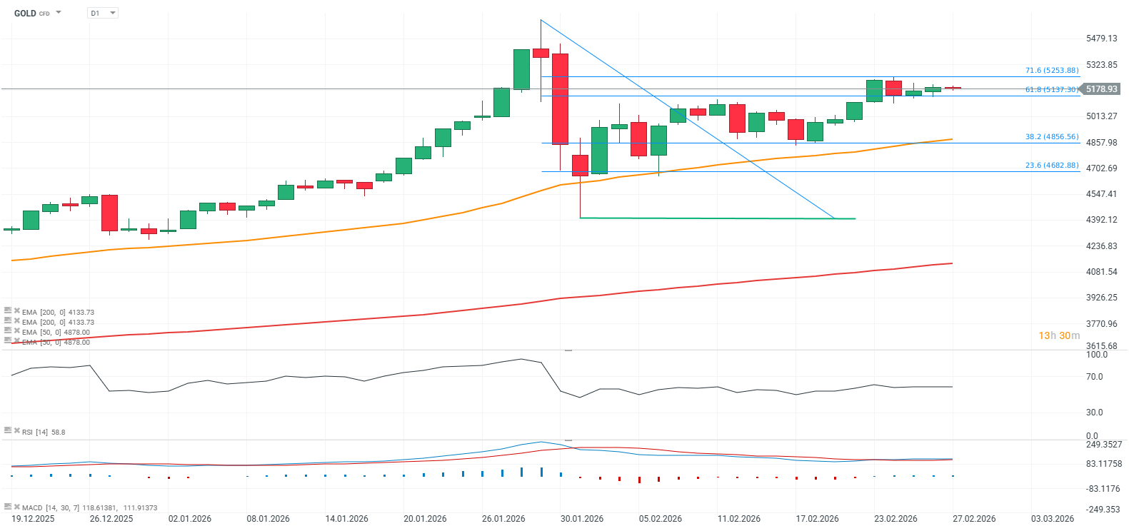 Nedávno zlato vzrostlo na 5 250 USD za unci, kde narazilo na první významnou rezistenci na úrovni 71,6% Fibonacciho retracementu posledního klesajícího impulzu. Po tomto růstu poptávka mírně ochladla, avšak poklesy se zastavily kolem 5 130 USD za unci, poblíž úrovně 61,8% Fibonacciho retracementu.
