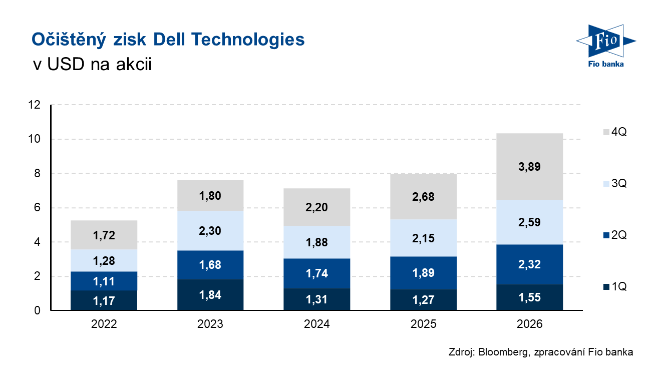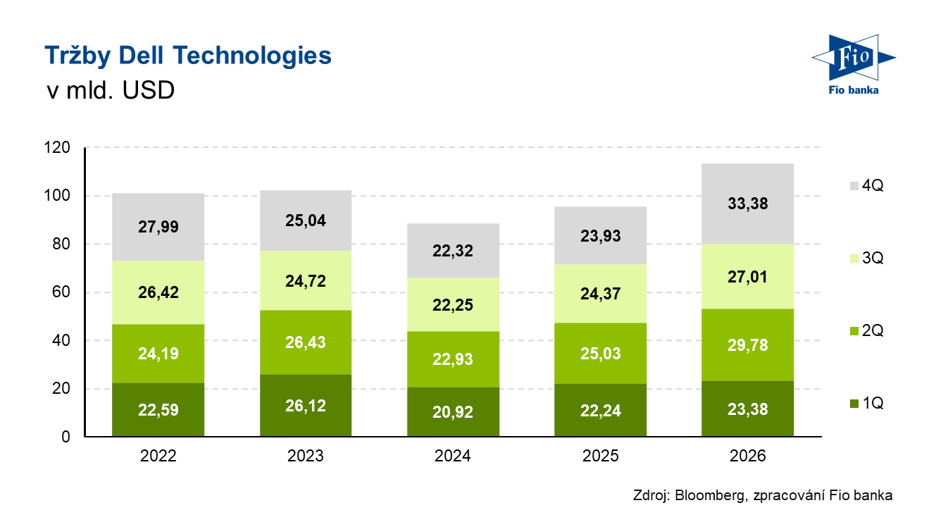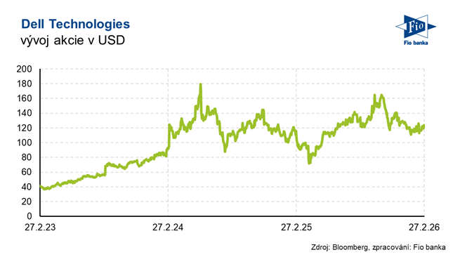 Americká společnost Dell Technologies podnikající v oblasti informačních technologií včera po uzavření trhu zveřejnila výsledky hospodaření za čtvrté čtvrtletí fiskálního roku 2026, které skončilo 30. ledna 2026. Jak tržby, jejichž meziroční růst zrychlil na 39 %, tak i očištěný zisk na akcii překonaly odhady analytiků. Výhled tržeb na první čtvrtletí i na celý rok 2027 byl výrazně nad očekáváním, podpořený serverovým byznysem společnosti. Firma zároveň oznámila zvýšení hotovostní dividendy o 20 % a navýšení programu zpětného odkupu akcií o 10 mld. USD.