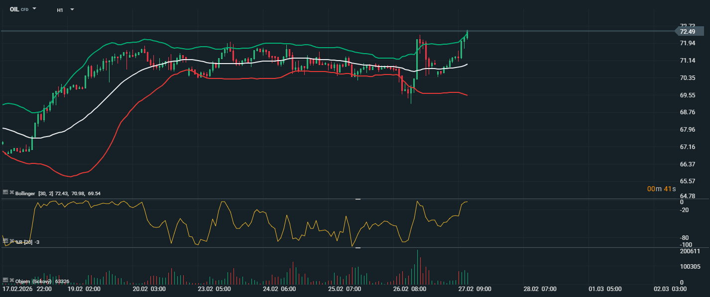 Cena ropy se pohybuje kolem 72,49 USD a po předchozí konsolidaci prorazila směrem vzhůru. Aktuálně se nachází u horní hranice Bollingerova pásma (cca 72,50 USD), což potvrzuje silné krátkodobé momentum. Střední linie pásma leží kolem 70,98 USD a funguje jako dynamická podpora. Spodní pásmo se nachází u 69,54 USD, což představuje výraznější krátkodobý support. Williams %R se pohybuje hluboko v překoupené oblasti, což naznačuje silný nákupní tlak, ale zároveň zvyšuje riziko krátkodobé korekce nebo konsolidace. Objem obchodů během růstu zesílil, což podporuje validitu aktuálního pohybu.