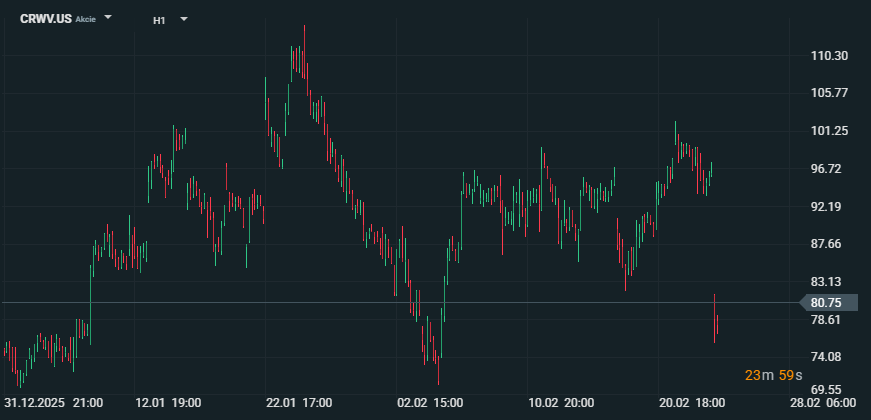 Akcie CoreWeave (CRWV) v pátek 27. února 2026 během dne klesaly o více než ~17 %, když trh vstřebával plán firmy více než zdvojnásobit kapitálové výdaje. Investoři řeší hlavně dopad na marže a otázku, jak bude „neocloud“ financovat tempo expanze podobné hyperscalerům. Zdroj: xStation5