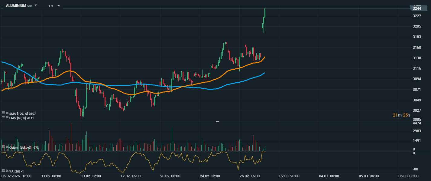 Cena hliníku vytvořila silný růstový gap a vystřelila až k úrovni 3 244 USD. Tento pohyb znamená průraz nad předchozí maxima a potvrzení pokračujícího býčího trendu. Cena se aktuálně drží výrazně nad klouzavými průměry EMA 50 (3 141 USD) i SMA 100 (3 107 USD), které mají rostoucí sklon. Oddálení od těchto průměrů signalizuje silné momentum, ale zároveň zvyšuje pravděpodobnost krátkodobé technické korekce. Objem obchodů během růstové fáze vzrostl, což podporuje validitu průrazu. Williams %R se pohybuje v překoupené oblasti, což ukazuje na intenzivní nákupní tlak, avšak i možné riziko krátkodobého vyčerpání trhu. Z technického pohledu bude klíčové sledovat, zda si cena udrží oblast nad 3 180–3 200 USD. Pokud ano, může následovat pokračování směrem k 3 300 USD. Naopak uzavření gapu a návrat pod 3 140 USD (EMA 50) by mohl otevřít prostor pro hlubší korekci k oblasti kolem 3 100 USD.