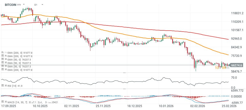 Z technického pohledu se Bitcoin v blízkém období pravděpodobně udrží v konsolidaci mezi 60 000 USD a 72 000 USD. Trh zřejmě hledá katalyzátor, který by vyvolal výraznější pohyb jedním či druhým směrem. Nelze vyloučit další sestupný impuls směrem k 50 000 USD, zejména pokud by se globální podmínky na akciových trzích dále zhoršily, což by podpořilo americký dolar, výnosy dluhopisů a ropu. Naopak rozhodný průraz nad oblast 74 000–75 000 USD by zvýšil pravděpodobnost trvalejšího pokusu o zotavení.