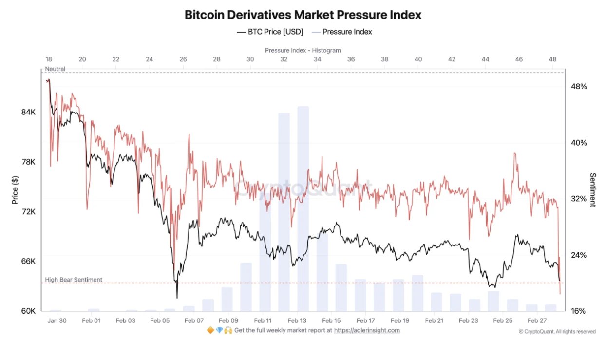Navzdory válce na Blízkém východě a zřetelně slabšímu sentimentu na akciových trzích — způsobenému růstem cen ropy a obnovenými obavami z inflace — reagoval Bitcoin relativně klidně. Po izraelských a amerických úderech na cíle v Íránu BTC v sobotu ráno krátce klesl k úrovni 63 000 USD, následně však posílil přibližně o 5 % a nyní se stabilizuje poblíž 66 500 USD. On-chain data zpočátku potvrdila prodejní tlak na derivátových trzích BTC, přičemž likvidace dosáhly přibližně 1,8 miliardy USD v pozicích. Trh však rychle znovu nalezl rovnováhu.