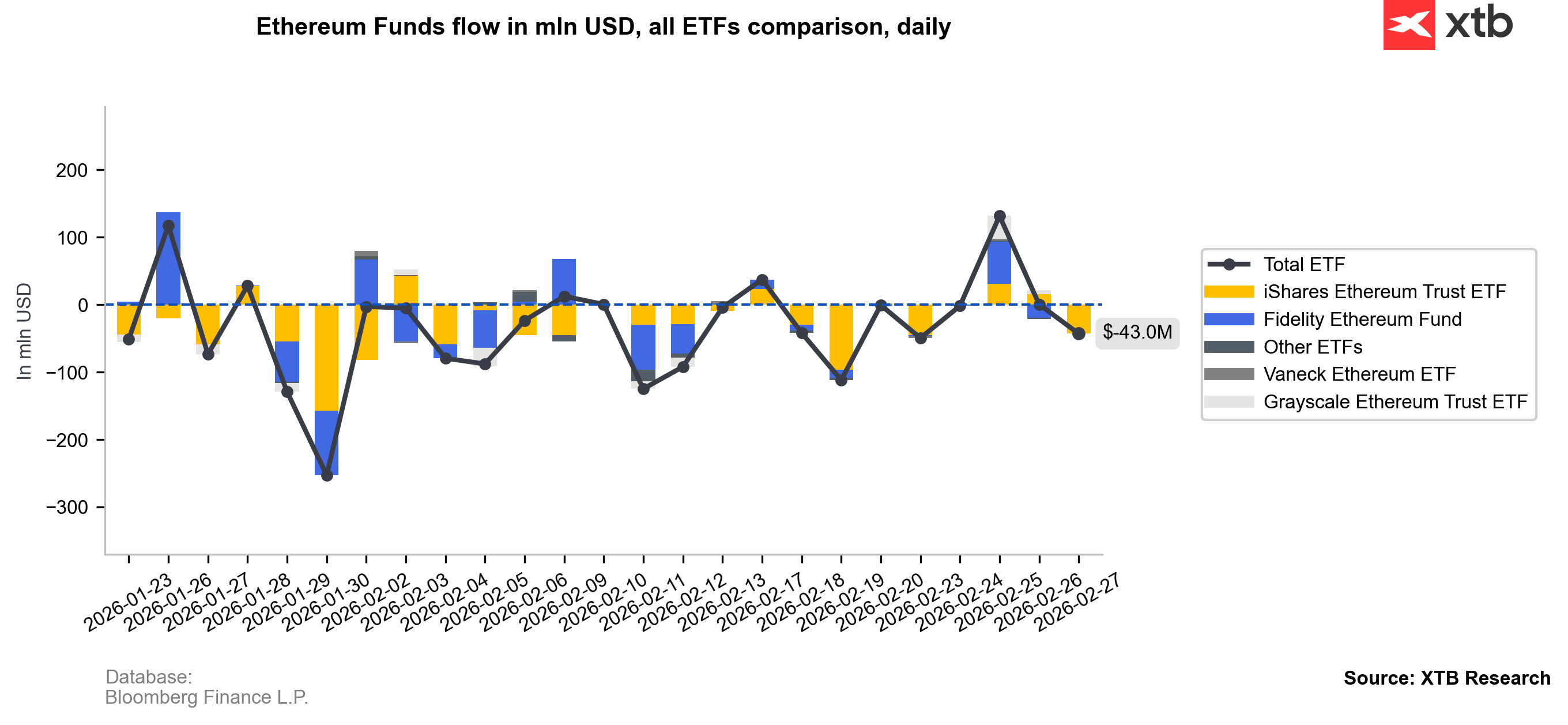 V této fázi tržního cyklu zůstává pozornost investorů pevně soustředěna na Bitcoin, zatímco Ethereum je zřetelně v ústraní. To je patrné i z toků do ETF: kapitál nadále směřuje především do Bitcoinu a bez trvalejšího oživení BTC se širší krypto bull market včetně ETH zatím jeví jako nepravděpodobný. S výjimkou minulého pondělí a pátku zaznamenaly Bitcoin ETF v uplynulém týdnu jasně pozitivní čisté přílivy kapitálu. Ethereum ETF naopak vykázaly pouze marginálně pozitivní toky.