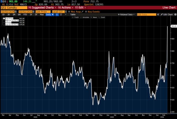 Burzovní cena zemního plynu v Evropě dnes ráno vyskočila až o 25 % (viz graf Bloombergu níže). Obchodníci se totiž obávají zejména blokády Hormuzského průlivu, která by od světa odstřihla katarský plyn. Ten sice směřuje zejména do asijských ekonomik, ale pokud ty by jej nedostaly, budou hledat alternativní dodavatele, například ty z USA. Evropa, která je na dovozu plynu z USA více závislá než kdy jindy, by se tak s Asií přetahovala o americký plyn, což by jeho cenu šponovalo. Obchodníci už nyní začali tuto možnost předjímat. Zdražení plynu v Evropě může zdražit také elektřinu, jejíž podstatná část se prostřednictvím plynu v Evropě vyrábí. Tím by došlo k dalšímu ochromení konkurenceschopnosti evropského průmyslu, který by tak mohl zesílit své volání po obnovení dodávek z Ruska, například plynovodem Nord Stream 2.