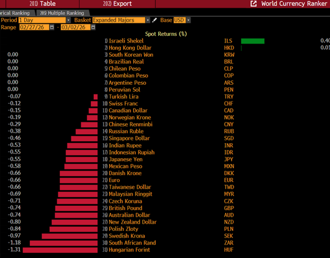 Jako bezpečné útočiště dnes funguje zlato, které atakuje, ale zatím nepřekonalo historicky rekordní korunovou cenu z konce letošního ledna, bezmála 114 000 Kč za troyskou unci. Vedle zlata je dnes bezpečným útočištěm také americký dolar, méně však už americké dluhopisy – což je překvapivé, neb ty patří tradičně k vyhledávaným bezpečným útočištím. Investoři se ale obávají rostoucího zadlužení USA a nevypočitatelnosti administrativy prezidenta Donalda Trumpa. Dolar samotný ale zpevňuje vůči prakticky všem významnějším měnám světa. Výjimku překvapivě představuje izraelský šekel (viz tabulka Bloombergu níže). Ten zpevňuje ještě více než dolar, takže vůči němu dolar slábne. Investoři totiž víkendové dění berou tak, že polevuje dlouhodobá, potenciálně fatální hrozba pro Židovský stát ze strany Íránu. Jak říkají izraelští investoři, podařilo se „setnout hlavu hadovi“.