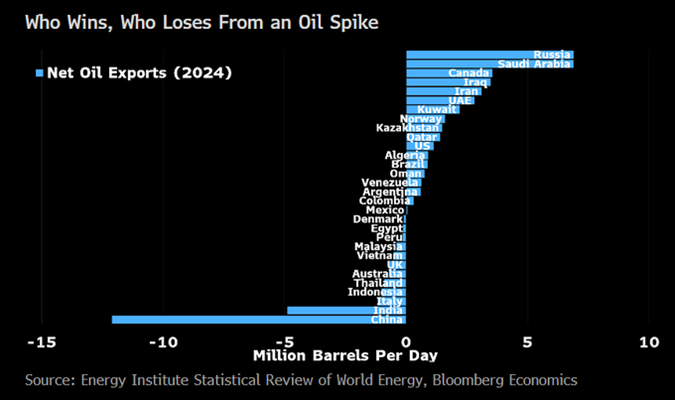 Evropské země s výjimkou Norska patří k poraženým současné situace kolem Íránu. Vítezem je Rusko, alespoň tedy z hlediska dopadu do cen ropy. Rusko totiž představuje jejího světově největšího čistého vývozce, společně se Saúdskou Arábií. Naopak nejjednoznačněji poraženými jsou Čína a Indie, tedy největší světoví čistí dovozci ropy ((viz graf Bloombergu níže).