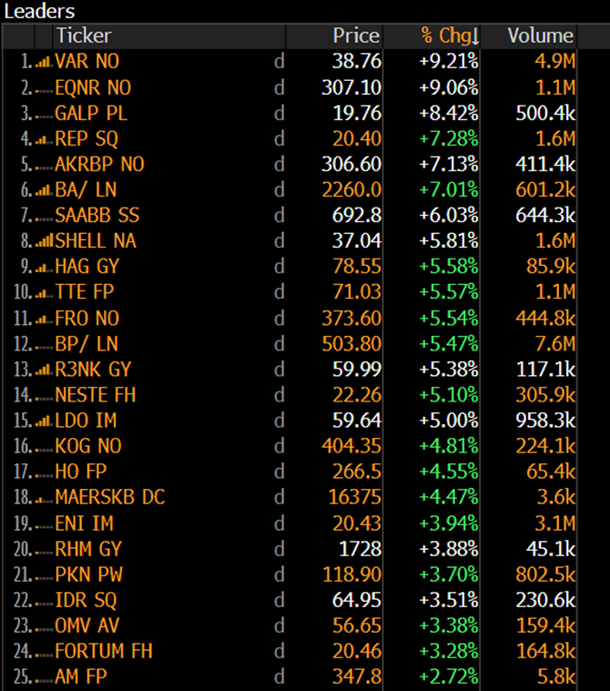 Po otevření evropských burz nejvýrazněji rostou akcie zbrojařů a energetických společností (viz tabulka Bloombergu níže); hitem jsou norské energetické firmy či skandinávské a německé zbrojovky. Chybí však mezi nimi jak Czechoslovak Group, tak ČEZ, které obchodování naopak zahájily poklesem. Mezinárodní investoři zřejmě ve zjitřené dnešní burzovní atmosféře strhávají penále za „východoevropský původ“. Nedaří se ale hlavně akciím cestovních kanceláří a leteckých dopravců. Zdražení energií typu ropy, nafty či zemního plynu by sice zvýšilo zisky energetikám, ale zdražilo turistický ruch. Takže by došlo k ochromení poptávky po cestování. Ochromení by samozřejmě nastalo nejen kvůli drahým palivům, ale i zvýšnému riziku v světě, včetně například hojně tusristicky vyhledávané Dubaje, jež o víkendu přišla o reputaci bezpečné destinace.