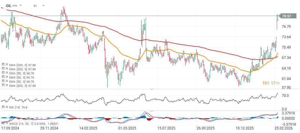 - Eskalace mezi Íránem a USA/Izraelem tlačí ropu výše: Investoři se zaměřují na rizika dodávek, zejména poté, co Írán pohrozil uzavřením Hormuzského průlivu, klíčové globální trasy pro přepravu ropy.