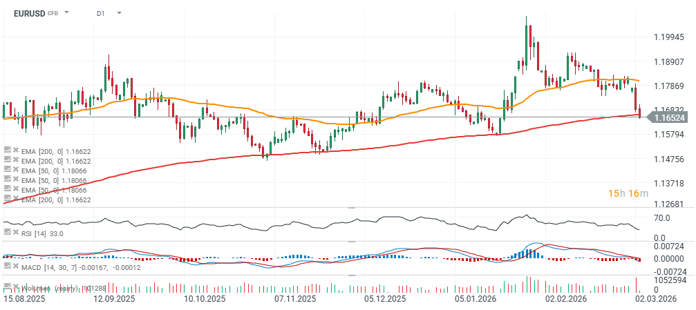 Euro dnes výrazně oslabuje pod tlakem posilujícího amerického dolaru a vyhlídky prudkého růstu cen energií, který by mohl „pohřbít šance“ na oživení evropského průmyslu. Měnový pár EUR/USD ztrácí více než 0,3 % a prolomil klíčovou úroveň podpory na 200denním exponenciálním klouzavém průměru (EMA200), od kterého se letos v roce 2025 již třikrát odrazil. Další růst cen ropy a plynu by mohl vyvinout výrazný dodatečný tlak, zatímco deeskalace či ukončení konfliktu s Íránem by naopak mohly přinést podporu.