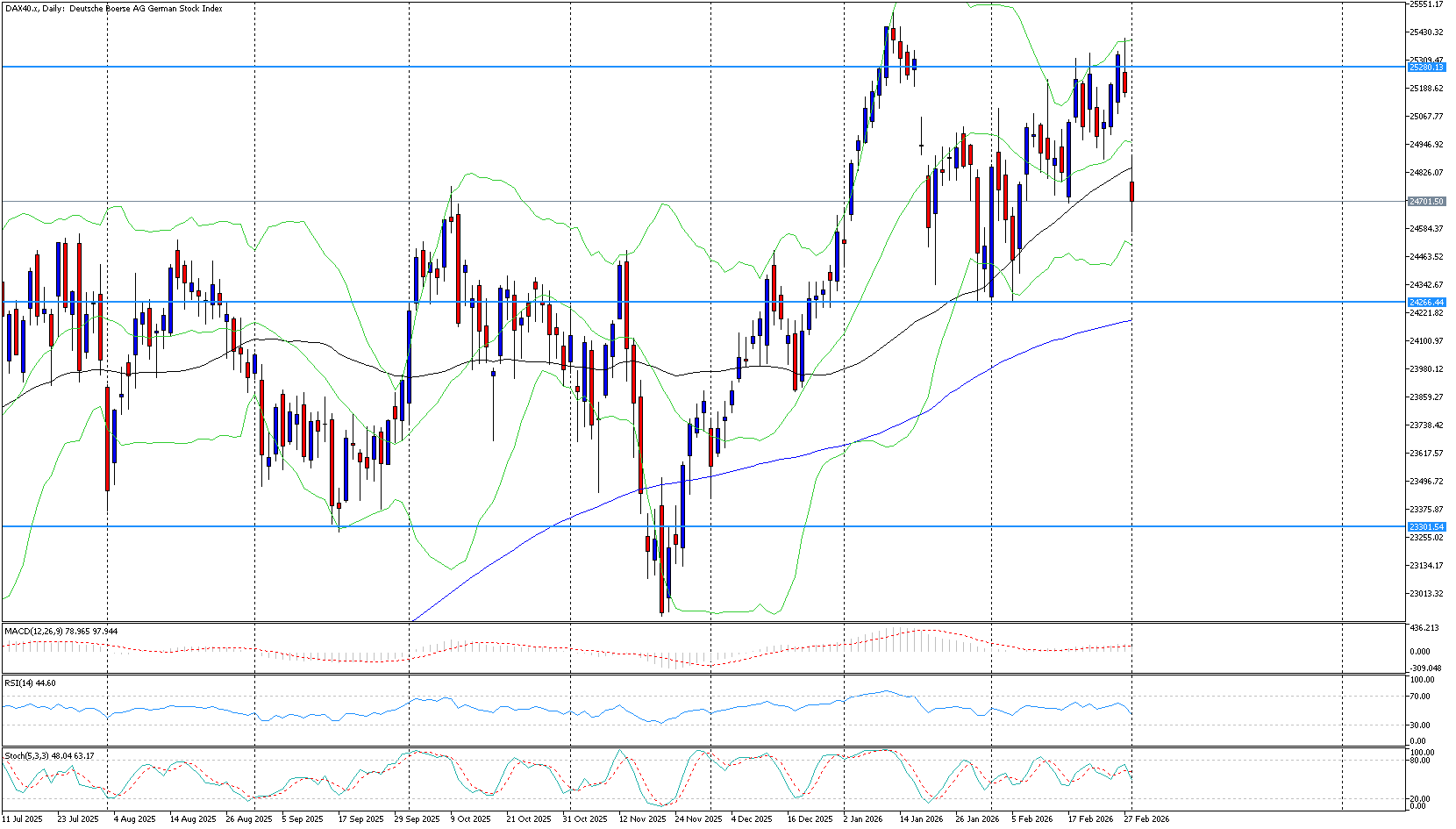 Index DAX40 zažívá devátou zelenou seanci za posledních jedenáct obchodních dní. Podle ředitele evropského oddělení MMF bude německá fiskální expanze potenciálně kompenzovat vyšší obchodní zátěž způsobenou výraznými americkými celními sazbami. Mezitím nedávné zmírnění celních hrozeb USA, zejména cel uvalených na automobilové součástky, podpořilo náladu investorů. Technické ukazatele naznačují býčí trend, neboť MACD se nachází vysoko nad svou spouštěcí linií. -