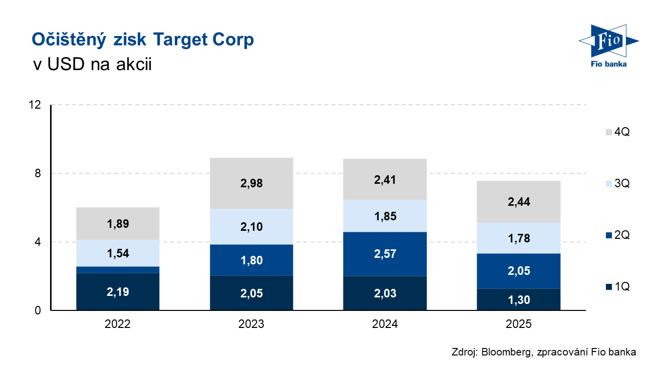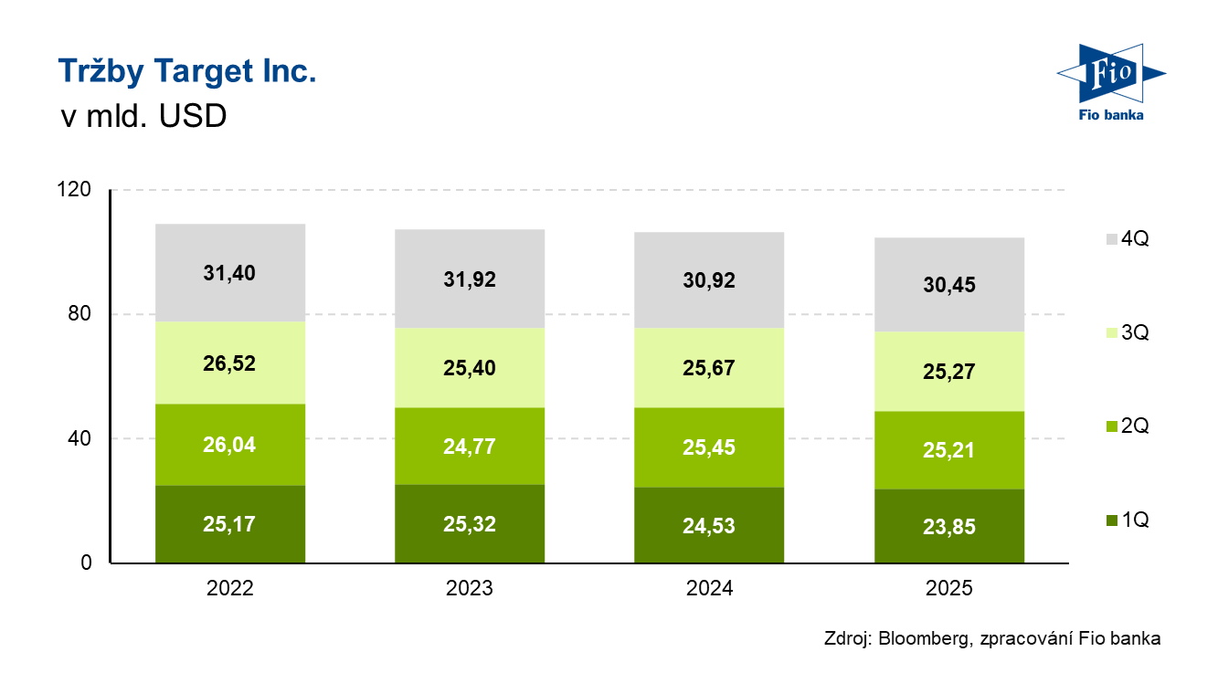 Klíčová slova: Analytik | Dividendy | Akcie | Bloomberg | CEO | Dividendový výnos | Marže | P/E | Pozice | Trend | Ukazatel | Výkonnost | Výnos | Zisk na akcii | USD | Obchodování | Zisk | Výsledky | EPS | Banka | Fio banka | Cena | Fio | Fiskální rok | Management | Trh | Zpráva | Cílová cena | Hrubá marže | Provozní marže | ROCE | Tržby | Pozornost investorů | Kapitalizace | Výhled | Konsensus | Vývoj úrokových sazeb | Očekávání | Odhady analytiků | Čistý zisk | Firma | Generální ředitel | Budoucnost | Solidní výsledky | Pokles | Provozní zisk | Meziroční růst | Vývoj | Růst | Posílení | JDE | Růst tržeb | Výhled na rok | Společnosti | Pozornost | Odkupy akcií | Společnost | Výsledky společnosti | Target | Celoroční výhled | 3М | TGT | Řetězec | Vital Knowledge | Adam Crisafulli | Tržní odhad | Zpětné odkupy | Milník | Akcie Target | Target (TGT) | Očištěný zisk na akcii | Využívání technologií | Prodeje | Fio banka, a.s. | Ředitel společnosti | Michal Šnobl | Adam | Rok 2026 |