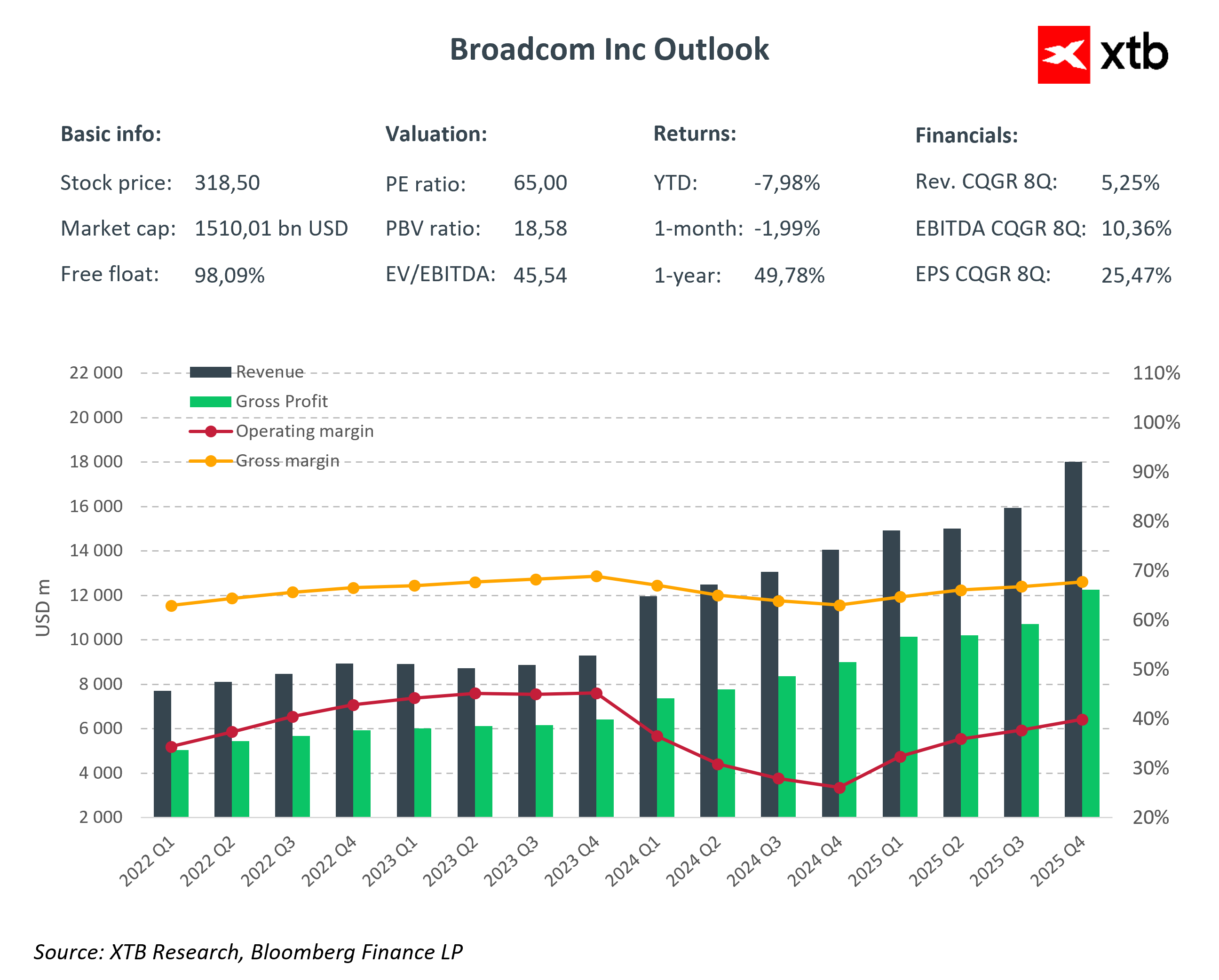 Nedávná euforie, kterou zažil americký kapitálový trh po znovuzvolení Donalda Trumpa americkým prezidentem, je relativně pryč. Cena mnoha akcií klesá, přestože očekávání byla překonána. Broadcom, americký globální výrobce a vývojář polovodičů, však potvrzuje svou pozici silného hráče v oboru, což se odráží v jeho posledních výsledcích za první čtvrtletí. Díky prudkému nárůstu tržeb z technologií umělé inteligence firma překonala očekávání analytiků a vykazuje slibný výhled na další období. Otázkou však zůstává, co na to říká samotná cena akcií? -