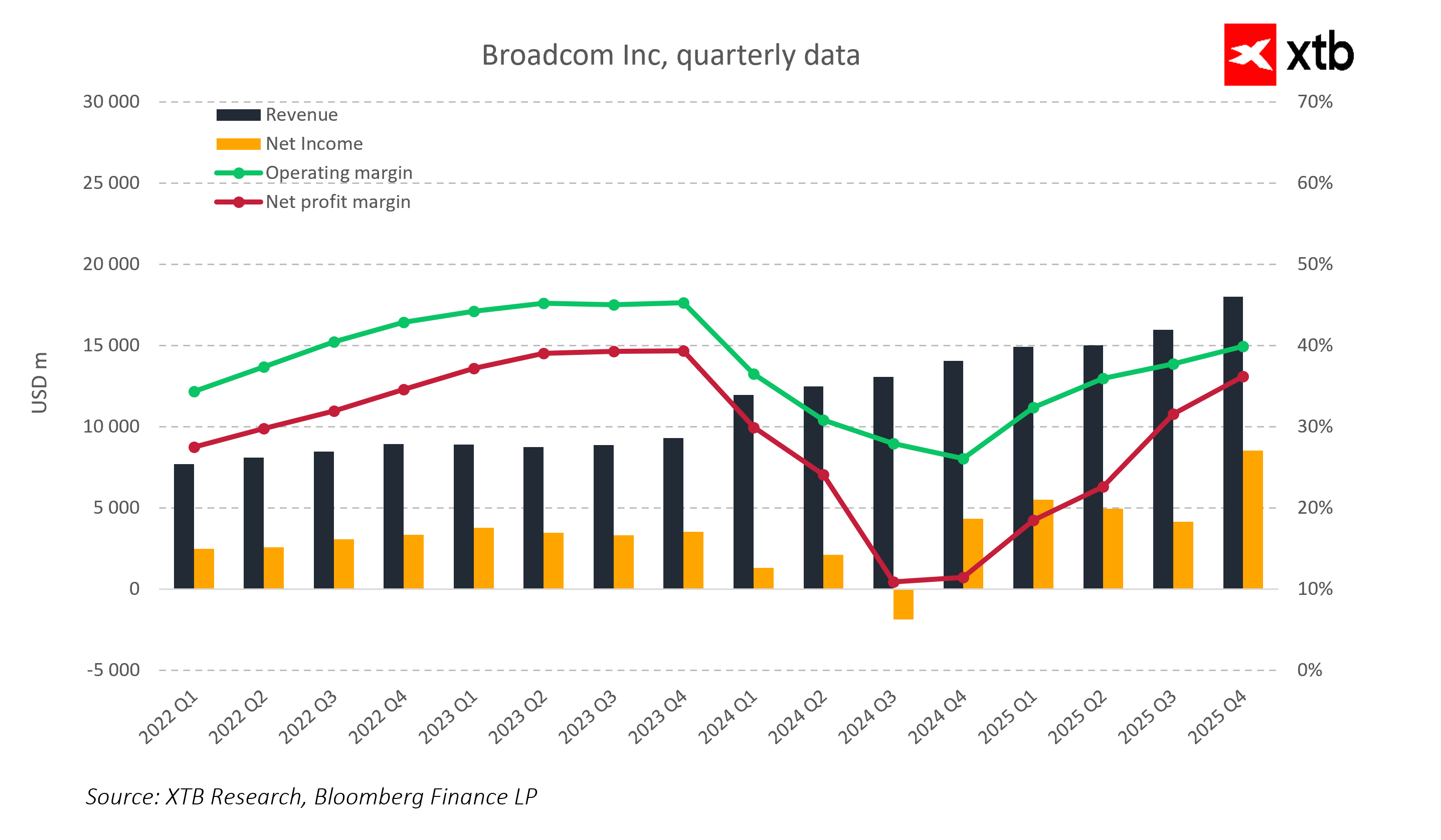 Nejnověji ze skupiny technologických gigantů zveřejnil své čtvrtletní výsledky Broadcom, přičemž jimi potvrdil, že mezi hlavní vítěze éry umělé inteligence nepochybně patří. Minulý rok totiž kvůli daňovým povinnostem plynoucím z přesunu duševního vlastnictví do USA došlo k výrazné jednorázové ztrátě, ale společnosti se opět podařilo vrátit k vysokým ziskům, což potěšilo i investory – akcie po zveřejnění výsledků vzrostly o 16 %. -