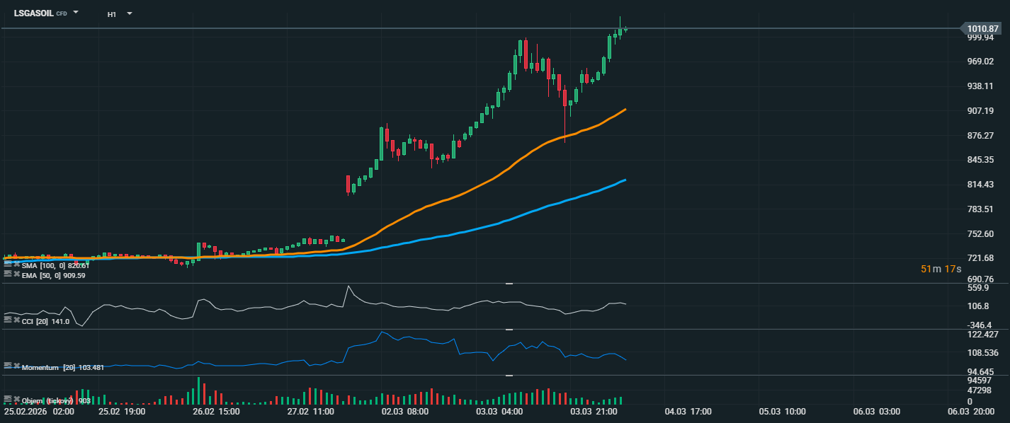 Na grafu LSGASOIL vidíme velmi silný růstový trend, kdy cena vystoupala až k úrovni 1010,87 USD, což představuje lokální maximum. Cena se aktuálně drží výrazně nad klouzavými průměry EMA 50 (909,59 USD) i SMA 100 (820,61 USD), což potvrzuje silný býčí trend. CCI dosahuje hodnoty 141, což signalizuje překoupený trh a velmi silné momentum kupců. Takto vysoké hodnoty často doprovázejí prudké impulsní pohyby, ale zároveň mohou upozorňovat na možnost krátkodobé korekce nebo konsolidace. Momentum se stále drží nad neutrální úrovní, což potvrzuje pokračující růstovou dynamiku, i když v posledních svíčkách je patrné mírné zpomalení růstu. Objem obchodů navíc během růstové fáze výrazně vzrostl, což naznačuje, že za pohybem stojí silná aktivita trhu. Z technického pohledu je nyní nejbližší rezistence v oblasti 1010–1020 USD, kde se trh aktuálně nachází. Pokud by došlo k jejímu průrazu, může se otevřít prostor pro další růst směrem k 1050 USD. Naopak při korekci by první silnější podpora ležela kolem 940–950 USD, zatímco výraznější support představuje oblast kolem EMA 50 na 909 USD.
