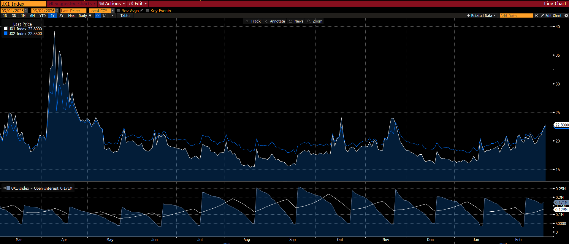 Rozdíl mezi nejbližším futures kontraktem na VIX a následující splatností vykazuje pouze velmi mírnou backwardation (22,8 pro UX1 vs. 22,55 pro UX2). To naznačuje, že trh oceňuje mírně zvýšené krátkodobé riziko, ale stále je daleko od scénáře výrazné paniky. Termínová struktura volatility zůstává relativně plochá, což spíše poukazuje na opatrné krátkodobé zajištění, než na očekávání dlouhodobého šoku volatility na trzích.