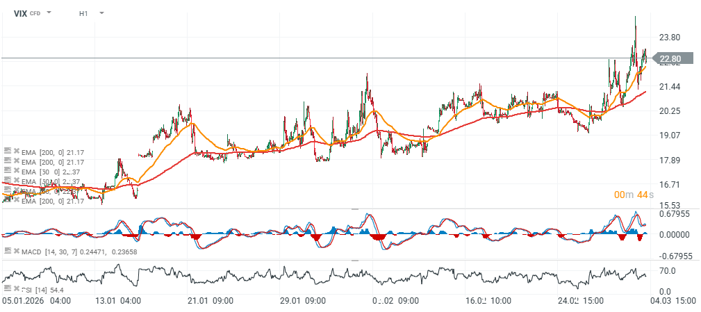 Při pohledu na RSI vidíme divergenci – indikátor se ochlazuje, přestože index zůstává v jasném růstovém trendu. Struktura MACD zároveň naznačuje možnost krátkodobého medvědího momenta vycházejícího z klouzavých průměrů. Na druhou stranu se na hodinovém časovém rámci VIX stáhl zpět přibližně k úrovni 50, což by mohlo potenciálně otevřít prostor pro další dynamický růstový pohyb.