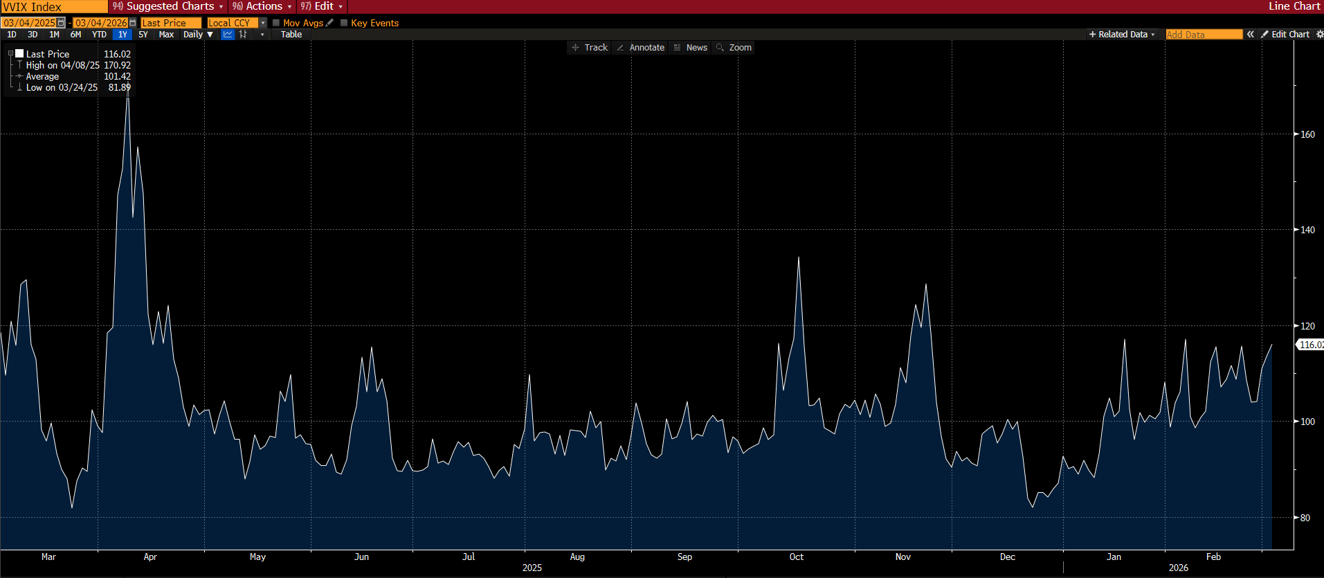 Hodnoty VVIX (očekávaná volatilita samotného indexu volatility) naznačují silnou poptávku po ochraně proti poklesu, trh však zatím nezapočítává pravděpodobný krach, který by pravděpodobně vyžadoval, aby VVIX vystoupal nad úroveň 130.