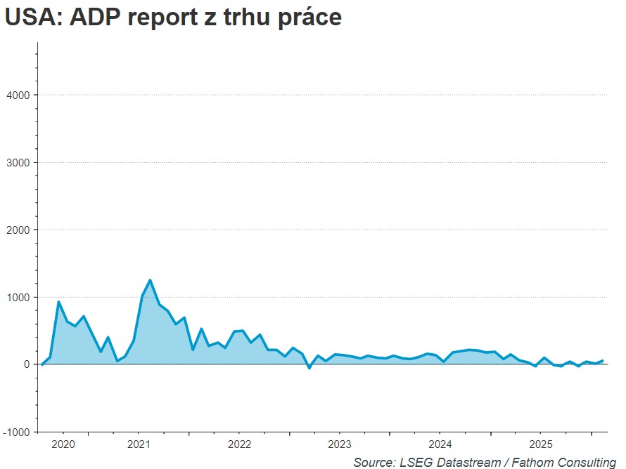 Počet pracovních míst podle ADP reportu z trhu práce v říjnu stoupl na 571 tis. oproti revidovaným 523 tis. v září. Trhy naopak očekávaly pokles na 400 tis. pracovních míst. -