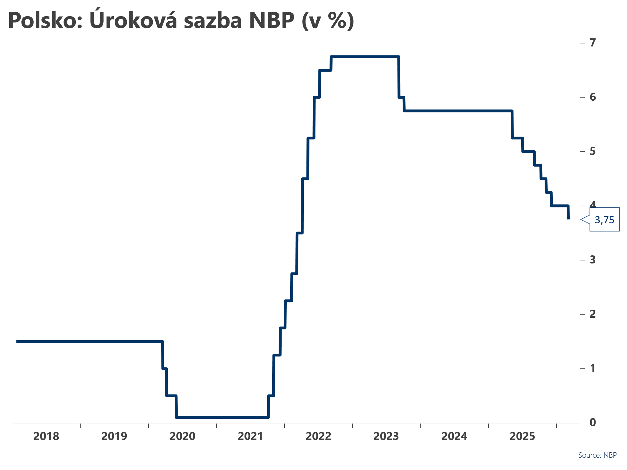 Polská centrální banka na svém dnešním zasedání snížila úrokovou sazbu podle očekávání trhů o 25bps na 3,75 %.