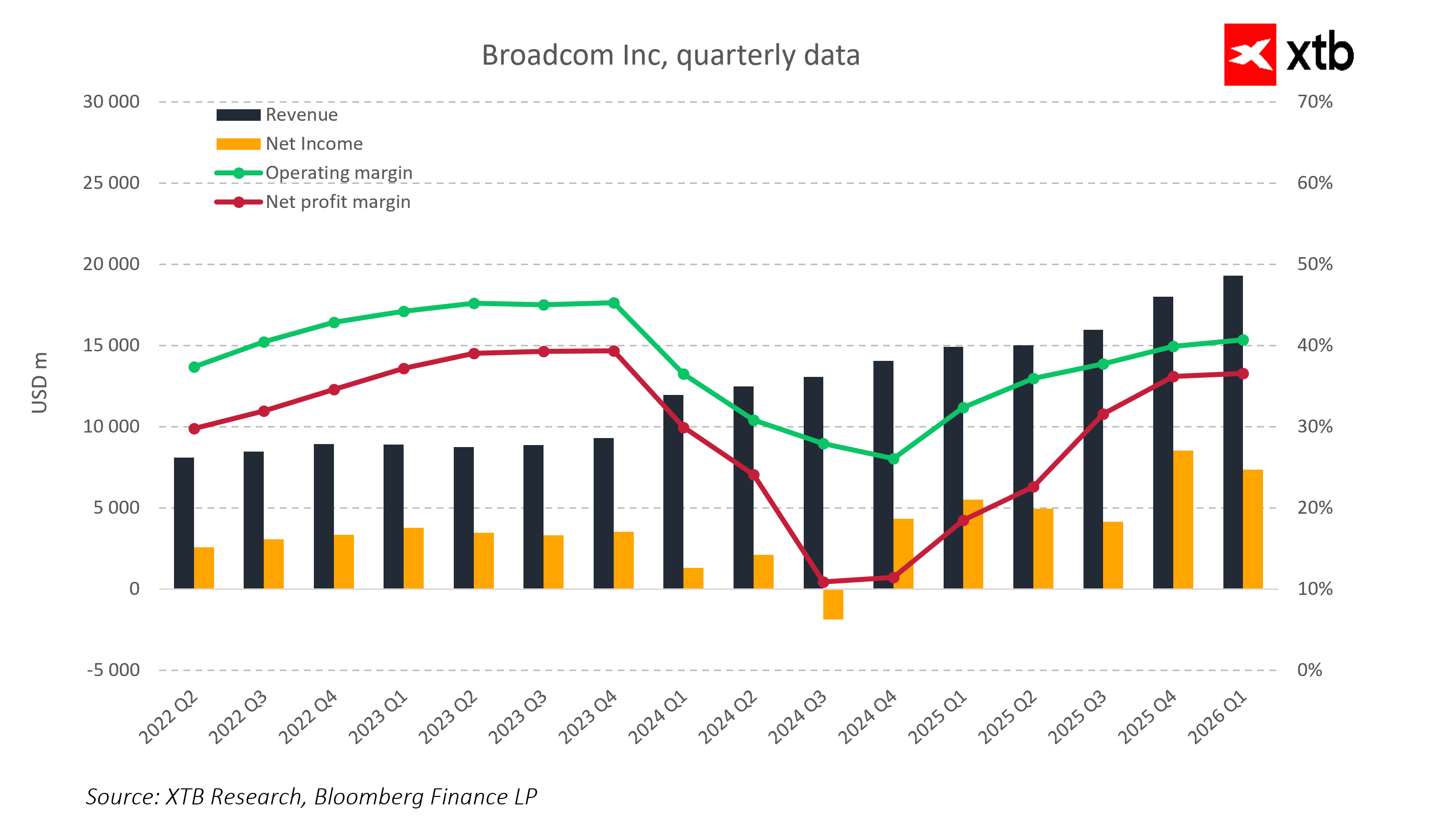 Finanční výsledky společnosti Broadcom za poslední čtvrtletí jasně ukazují rostoucí trend tržeb a výrazné zlepšení ziskovosti. Tržby nadále rostou a dosahují rekordních úrovní, což potvrzuje účinnost strategie společnosti v rychle se vyvíjejících segmentech polovodičů a softwarové infrastruktury. Vysoké provozní a čisté marže odrážejí efektivní řízení nákladů a silnou konkurenční pozici společnosti Broadcom.