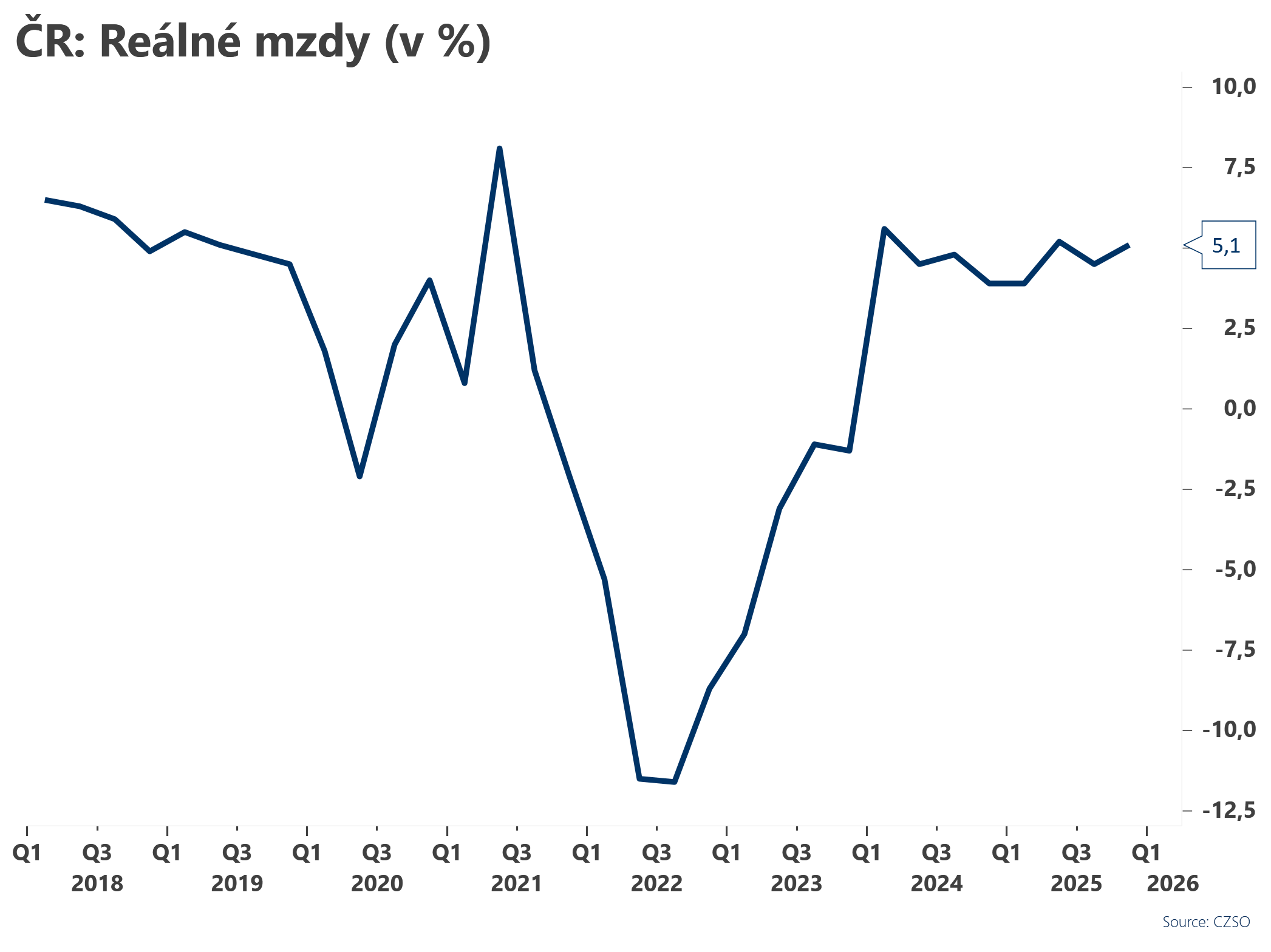 Reálné mzdy ve čtvrtém čtvrtletí 2025 mezikvartálně vzrostly o 5,1 %, což představuje velmi silné tempo a zároveň potvrzuje pokračující obnovu kupní síly domácností po předchozích letech vysoké inflace. Trhy očekávaly růst o 4,7 % mezikvartálně.