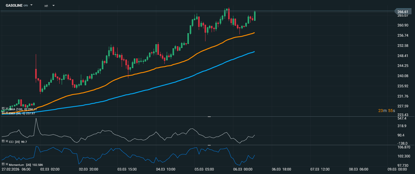 Cena benzínu zůstává v silném růstovém trendu a aktuálně se pohybuje poblíž 265,07 USD, tedy těsně pod krátkodobou rezistencí v oblasti 266,61 USD. Trh se po prudkém růstu drží vysoko nad klouzavými průměry, přičemž EMA 50 se nachází na 257,97 USD a SMA 100 na 250,11 USD, což potvrzuje pokračující převahu kupců. Struktura trhu zůstává býčí, protože cena vytváří vyšší maxima i vyšší minima a ani poslední krátkodobé výkyvy zatím nenaznačují výraznější obrat. CCI dosahuje hodnoty kolem 99,7, což ukazuje na stále zvýšené nákupní momentum, i když už se trh pohybuje blízko překoupenějších úrovní. Momentum se drží na 102,586, takže růstová dynamika sice přetrvává, ale v úplně krátkém horizontu je patrné určité kolísání a možné zpomalení po předchozí silné vlně. Pokud se benzínu podaří udržet nad pásmem 262–263 USD, zůstává prostor pro další test rezistence na 266,61 USD a případné pokračování směrem výše. Naopak při oslabení by první důležitou podporu představovala oblast kolem 258 USD, kde se nachází EMA 50, a níže potom silnější support u 250 USD v blízkosti SMA 100.