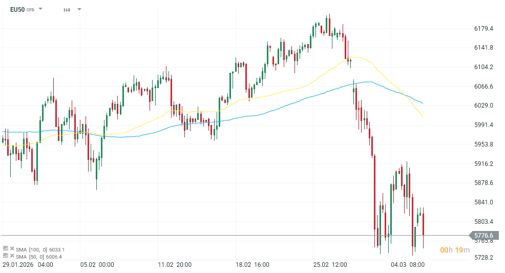 Německý index DAX se aktuálně obchoduje kolem úrovně 23 850 bodů. Od začátku letošního roku však stále ztrácí více než 2,5 %, což odráží opatrnost investorů a zvýšenou volatilitu na evropských trzích. Od začátku konfliktu DAX odepisuje přes 3 %, přičemž před konfliktem se obchodoval nad hranicí 25 000bodů. Podobný vývoj sledujeme i u indexu Euro Stoxx 50, který se aktuálně pohybuje přibližně kolem 5 800 bodů. Za poslední týden index odepisuje 5 % a od začátku roku EU50 ztrácí 1 %. Celkově zatím evropské indexy po úvodní panice nereflektují zvýšené geopolitické riziko a obchodují se jen mírně po svým historickým maximem.