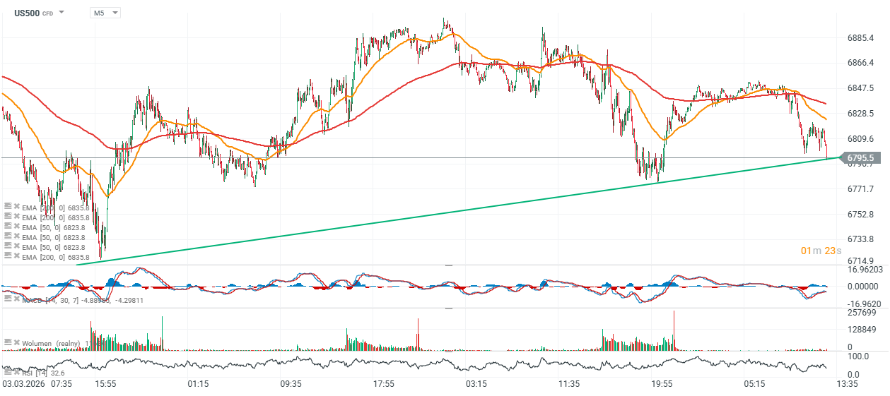 - V krátkém horizontu může US500 dál respektovat spodní hranici trendové linie, nicméně průraz pod 6 800 bodů by mohl vyvolat tlak na opětovné otestování lokálních minim poblíž 6 720 bodů. Indikátor RSI na krátkodobém 5min intervalu znovu klesl blízko 30, což signalizuje přeprodané podmínky.