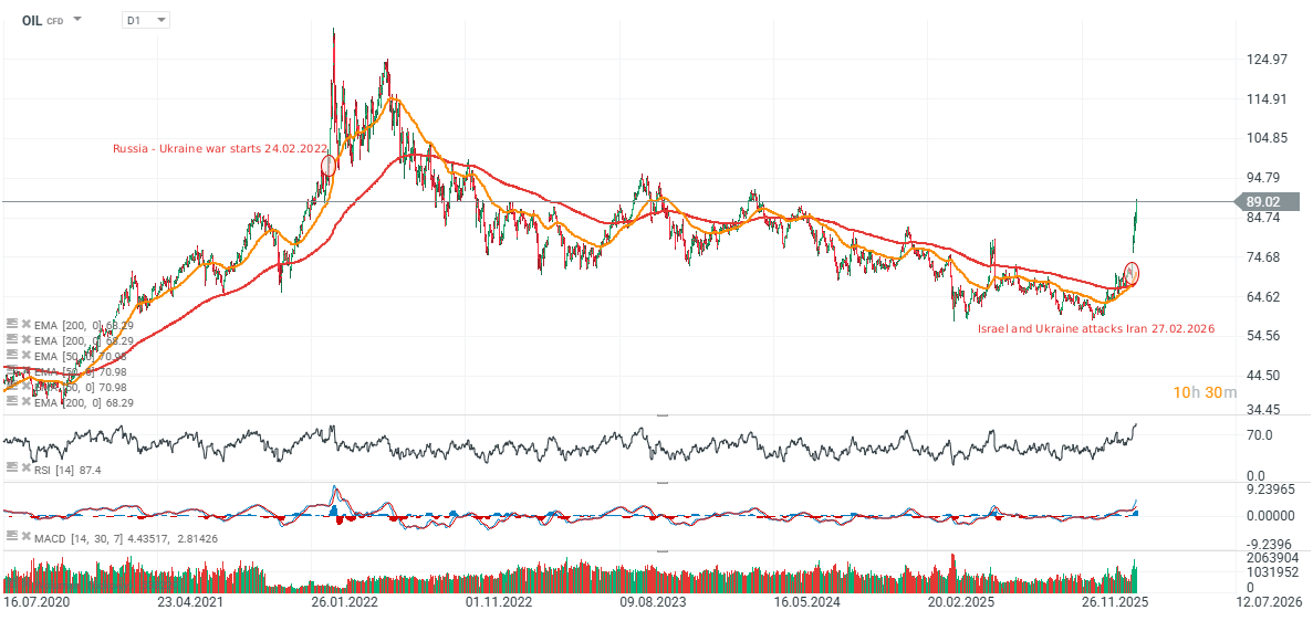 - Aktuálně se zdá, že potenciální narušení Hormuzského průlivu v kombinaci s útoky na ropnou infrastrukturu ve Spojených arabských emirátech nebo v Kataru, které by mohly trvat týdny, má výrazně větší potenciál podpořit další spekulativní růst cen ropy. Hodně bude záviset na tom, jak dlouho bude konflikt trvat a zda si Írán udrží schopnost provádět útoky na sousední země.