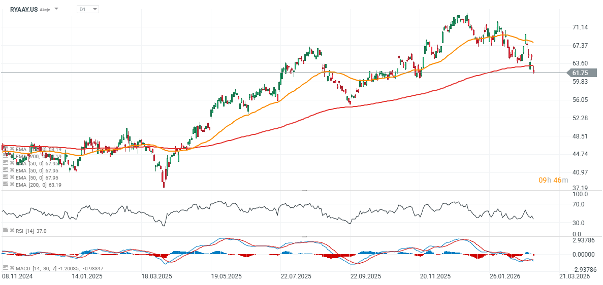 Akcie Ryanairu zaznamenávají výrazný pokles a propadly se pod dlouhodobý klouzavý průměr EMA200 (červená linie). Naposledy akcie klesly pod tuto úroveň v dubnu 2025, kdy korekce nakonec dosáhla téměř 30 % vůči klouzavému průměru. Klíčové úrovně podpory se nyní jeví kolem 60 USD za akcii a následně kolem 55 USD, kde už dříve docházelo k cenovým reakcím.