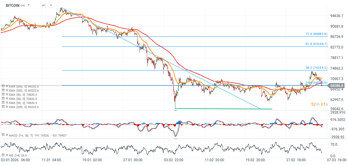 - Pokud býci rychle nezískají zpět úroveň 70 000 USD, trh může čelit dalšímu medvědímu impulzu, přičemž potenciální support se nachází poblíž 60 000 USD.