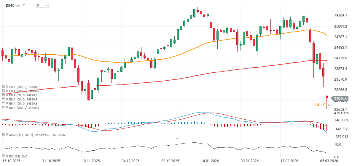 Evropské akciové trhy reagovaly panikou na prudký růst cen ropy, přičemž ropa se po 15% skoku obchoduje poblíž 107 USD za barel. Německý futures kontrakt na DAX (DE40) patří mezi největší poražené v Evropě, protože region zůstává silně závislý na dovozu ropy a plynu z Blízkého východu. Vzhledem k vysokému zastoupení chemických a průmyslových společností na německém akciovém trhu se zdá být obzvlášť zranitelný vůči dlouhodobě negativním dopadům vyšších cen energií.