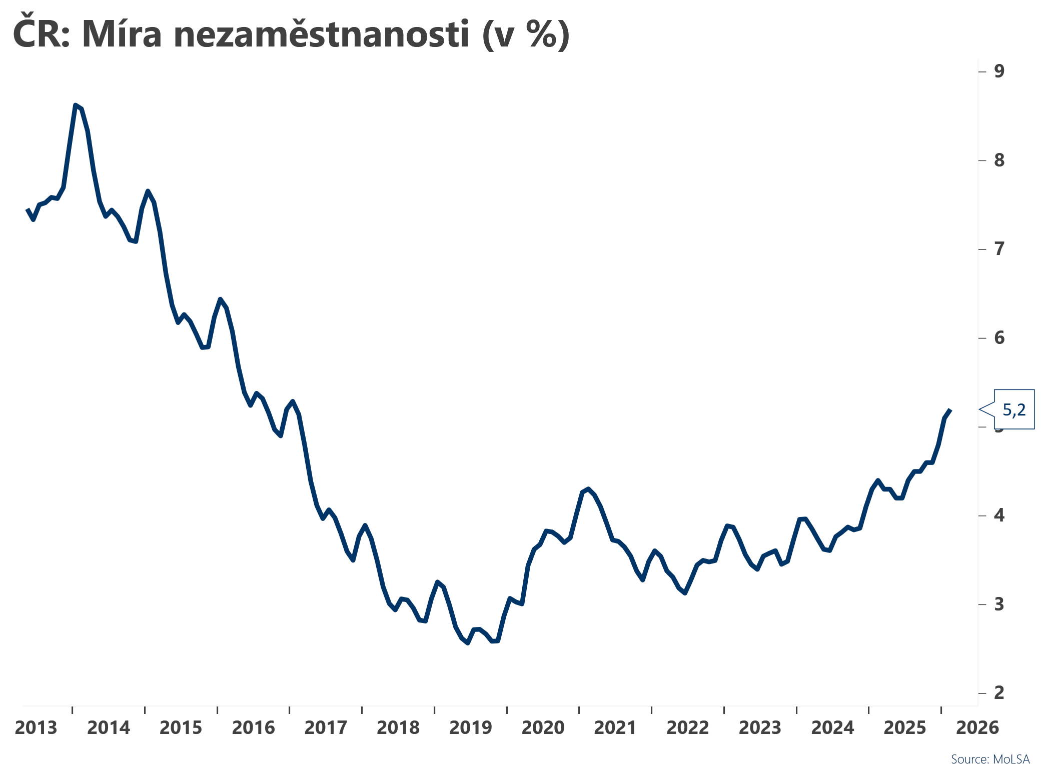Nezaměstnanost v září stoupla z 3,4 % na 3,5 % a na trhu pokračuje trend nastavený v posledních měsících. Počet uchazečů o zaměstnání stoupá, počet volných pracovních míst naopak dále klesá. Volných pracovních pozic je nyní nejméně od poloviny roku 2018, což naznačuje jisté ochlazování na domácím trhu práce a nechává prostor pro další mírný nárůst podílu nezaměstnaných. Na druhou stranu zářijový růst nezaměstnanosti byl trhem očekávaný a velkou měrou stál i na vlivu zaokrouhlování, kdy reálně podíl nezaměstnaných rostl jen zhruba o 0,05 p.b. Říjen a listopad historicky patří mezi měsíce, kdy sezónní vlivy hrají spíše ve prospěch poklesu nezaměstnanosti a neočekáváme proto, že by následující měsíce měly přinést výraznější změnu na trhu práce, a to i přesto, že některé předstihové ukazatele varují před zhoršením. Naopak na přelomu roku může nezaměstnanost navázat na pozvolný růst a atakovat hranici 4 %. -