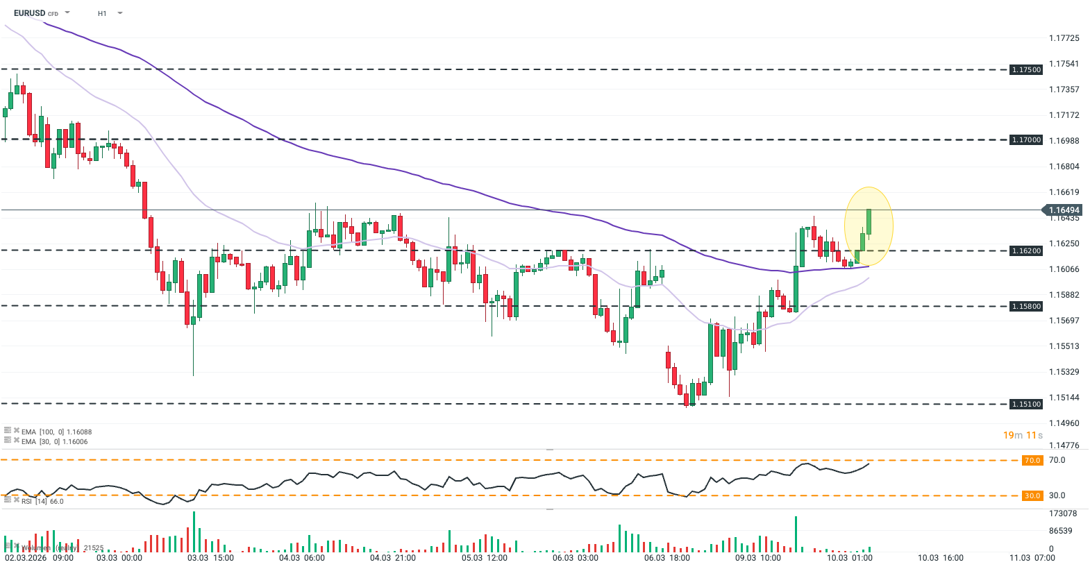 Navzdory slabosti v úvodu asijské seance se EURUSD odrazil od EMA100 (tmavě fialová) a vrátil se nad hranici 1,162, kde se nyní obchoduje na nejvyšší úrovni od 4. března.