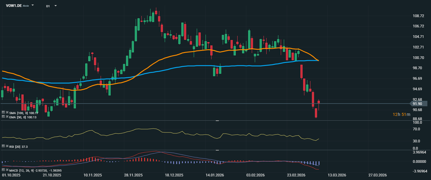 Akcie společnosti Volkswagen výrazně oslabily a aktuálně se obchodují kolem úrovně 91,90 EUR. Cena se po předchozí konsolidaci prudce propadla pod oba klouzavé průměry, tedy pod EMA 50 na hodnotě 100,13 EUR i SMA 100 kolem 100,17 EUR, což potvrzuje zhoršení technického obrazu a návrat výraznějšího prodejního tlaku. RSI se pohybuje na hodnotě 37,3, což ukazuje na slábnoucí sílu kupců a rostoucí převahu prodejců. Trh se sice zatím ještě nedostal do jasně přeprodaného pásma, ale momentum zůstává slabé.