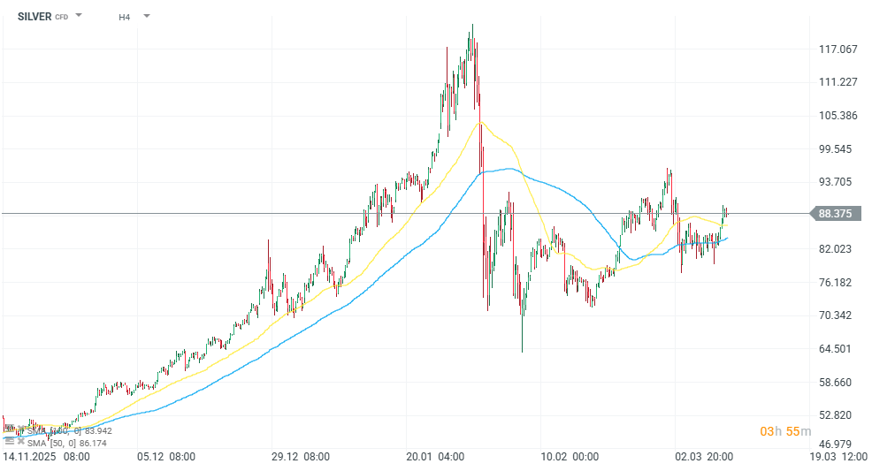 Stříbro si z pondělních minim poblíž 80 dolarů připisuje solidní zisky a aktuálně se pohybuje kolem 88 dolarů za unci. Prvotní pokles ceny souvisel s prudkým růstem ropy a zvýšenou geopolitickou nejistotou na trzích. Během dne se však nálada investorů postupně uklidnila, k čemuž přispěl také americký prezident Donald Trump, který uvedl, že konflikt by mohl brzy skončit. Ceny ropy se následně vrátily pod hranici 100 dolarů za barel. Stříbru navíc pomohlo oslabení amerického dolaru a pokles výnosů amerických státních dluhopisů, což tradičně podporuje ceny drahých kovů.