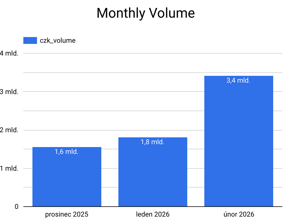 - Celkový objem obchodů v únoru prudce vzrostl na 3,4 miliardy Kč oproti lednovým 1,8 miliardám Kč.