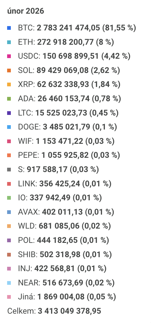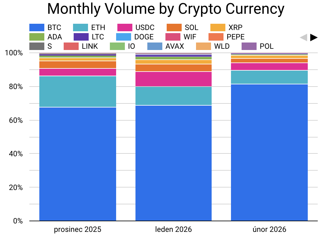 - Dominance bitcoinu dosáhla 81,55 % veškerého objemu, což je nárůst o více než 12 procentních bodů oproti lednu.