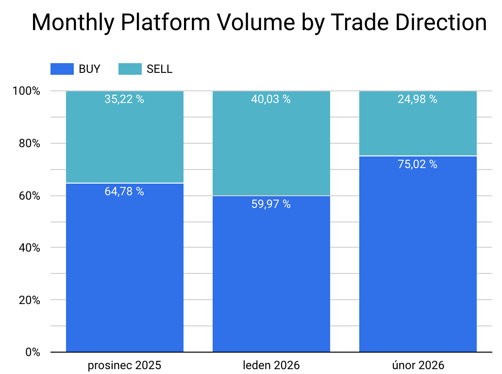- Nákupní horečka ovládla trh. Poměr nákupů k prodejům vystřelil na 75,02 %, zatímco v lednu tvořily nákupy 60 % obchodů.