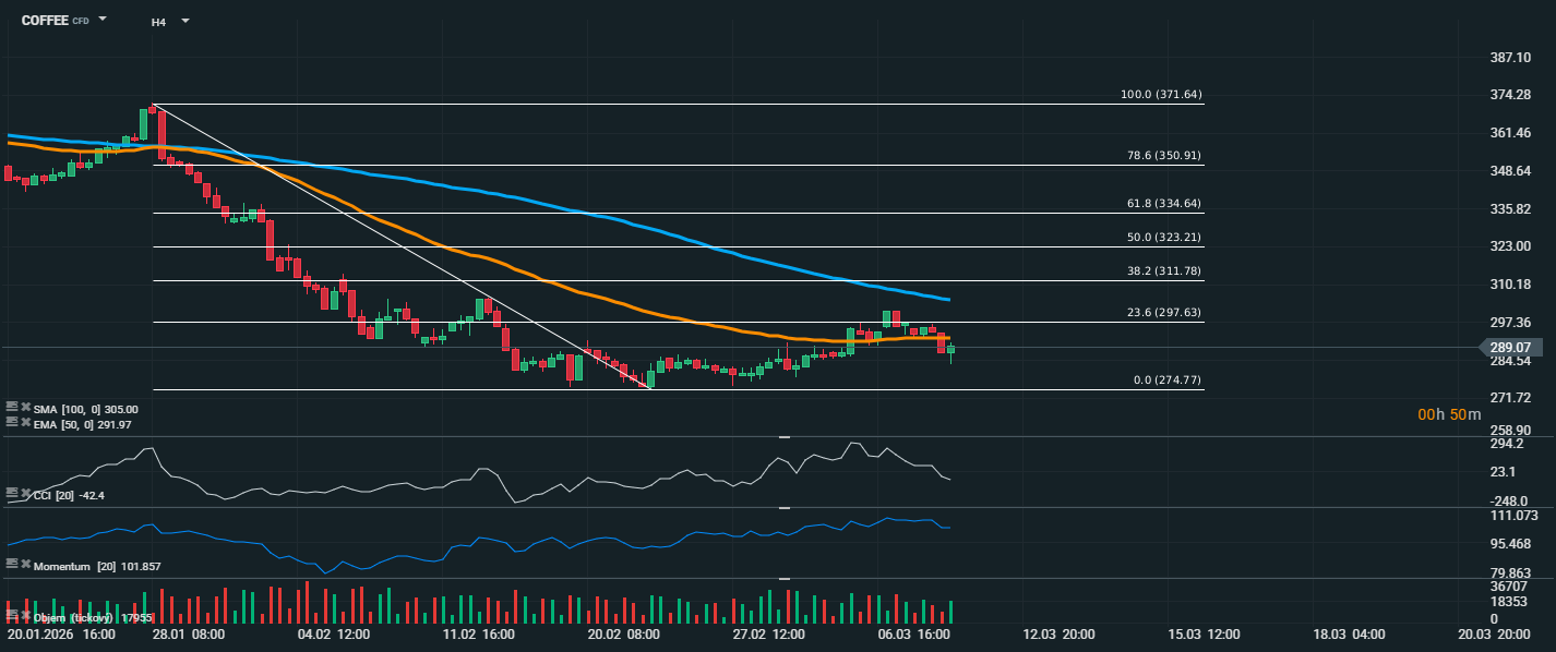 Cena kávy se aktuálně pohybuje kolem 289,07 USD a po předchozím prudším poklesu se snaží stabilizovat nad minimem na úrovni 274,77 USD. Trh sice v posledních dnech mírně korigoval vzhůru, ale stále zůstává pod důležitými technickými bariérami, což ukazuje, že převaha kupců zatím není dostatečně silná. Z technického pohledu je důležité, že cena se nachází pod EMA 50 na úrovni 291,97 USD i pod SMA 100 kolem 305,00 USD. To potvrzuje, že krátkodobý i střednědobý trend zůstává spíše medvědí. Navíc se trh drží pod Fibonacciho hladinou 23,6 % na 297,63 USD, která nyní funguje jako nejbližší významnější rezistence. Dokud se káva nevrátí nad tuto oblast, bude dosavadní pohyb působit spíše jen jako technické nadechnutí po výprodeji.