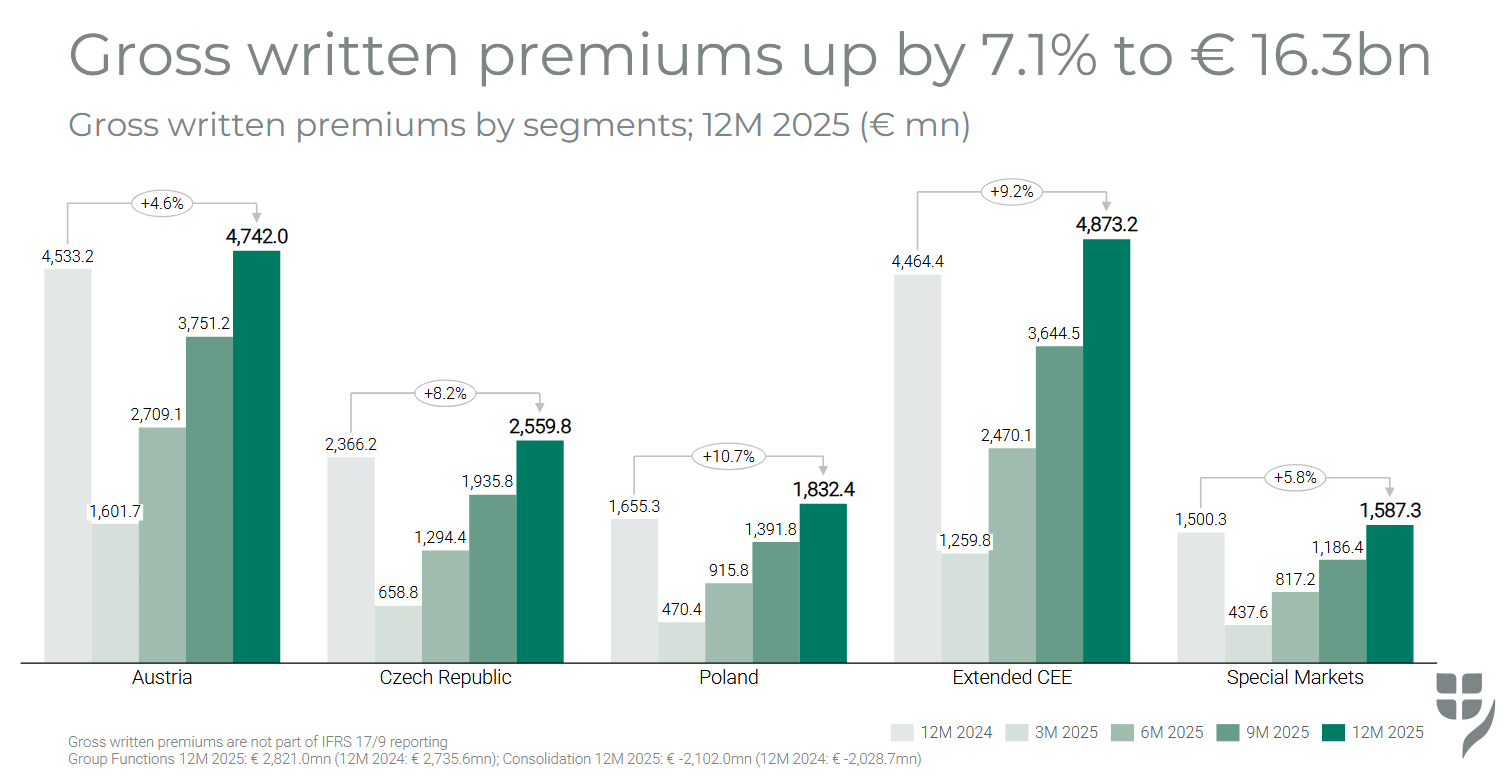 Největšího meziročního růstu hrubého předepsaného pojistného ve výši 10,7 % dosáhlo Polsko na 1,83 mld. EUR. Rozšířený region střední a východní Evropy pak dosáhl 9,2% růstu na 4,87 mld. EUR, když se zde dařilo Chorvatsku (+12,9 %) či Rumunsku (+9,3 %). Česká republika zaznamenala růst o 8,2 % na 2,56 mld. EUR. Segment speciálních trhů, kam VIG zahrnuje Německo, Turecko, Lichtenštejnsko a Gruzii vzrostl meziročně o 5,8 % na 1,59 mld. EUR. Domácí Rakousko vzrostlo o 4,6 % meziročně na 4,74 mld. EUR.