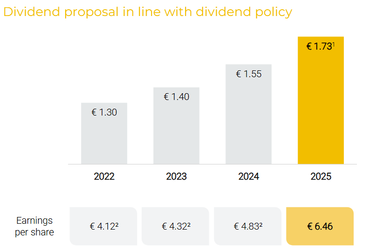 VIG v souladu s dividendovou politikou, jejíž cílem je trvalé zvyšování dividend, navrhne za rok 2025 zvýšení dividendy o 12 % na 1,73 EUR. Analytici očekávali 1,76 EUR. Dividenda za rok 2024 činila 1,55 EUR.