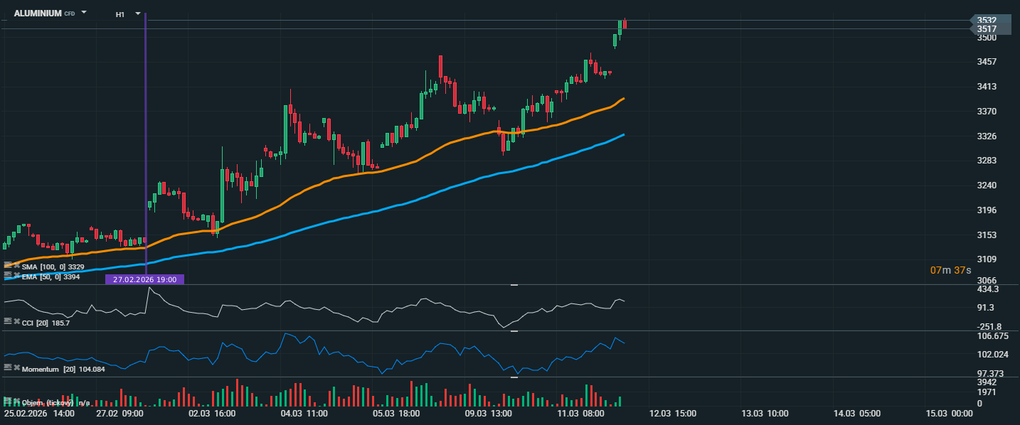 Z technického pohledu bude důležité sledovat, zda se hliník udrží nad pásmem 3500–3517. Pokud ano, může růstový impuls pokračovat i na vyšší úrovně. Nejbližší podpory se nacházejí kolem 3457 a poté v oblasti 3394, kde leží i EMA 50. Dokud cena zůstává nad těmito hladinami, zůstává krátkodobý trend jednoznačně pozitivní.