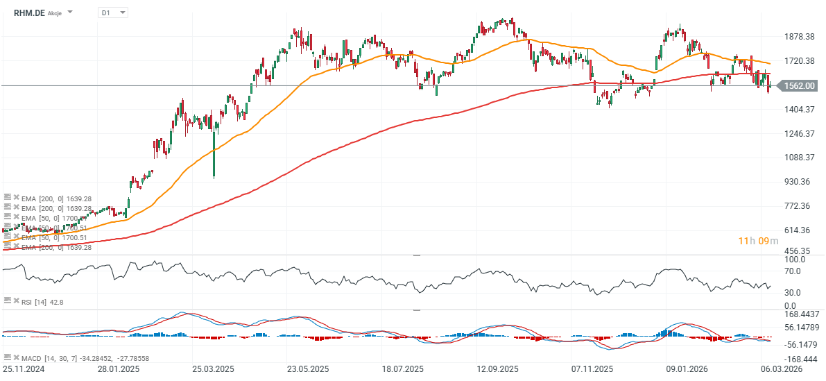 Akcie německého Rheinmetallu se po včerejším výprodeji pokoušejí stabilizovat, titul ale stále zůstává pod úrovní 1 640 EUR, kde se nachází EMA 200 (červená linie).